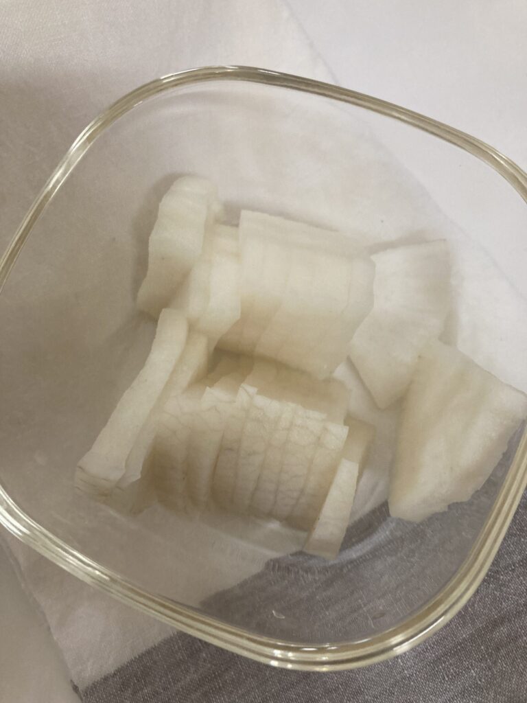 - 大根は2cmほどの厚さに切り、軽く下茹でします(5分ほど)。